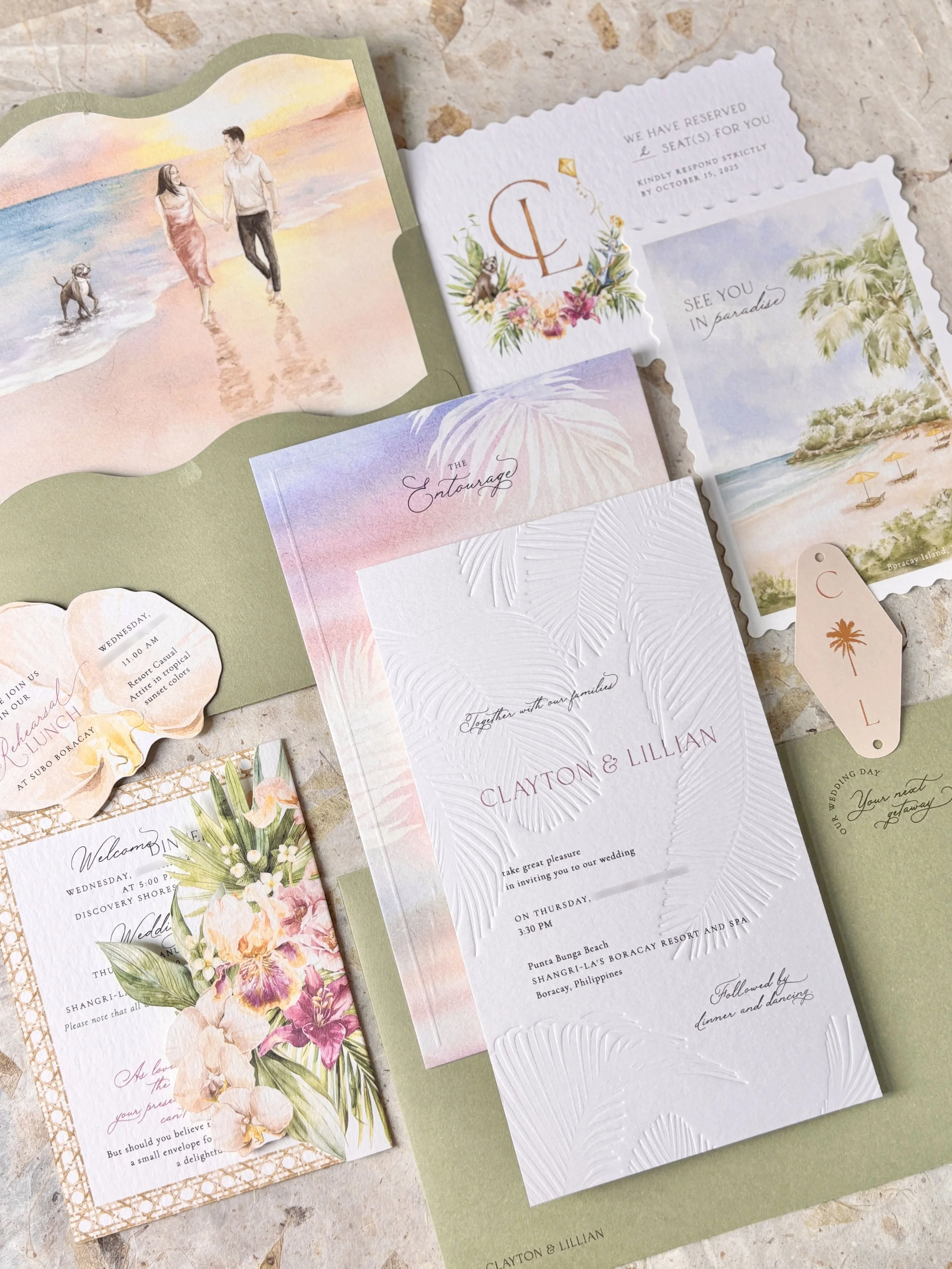 Clayton and Lillian’s wedding invitation suite was designed to evoke a nostalgic sunset beach getaway, capturing the laid-back romance of their destination wedding in Boracay. Blending a clean, modern layout with vibrant illustrations, the suite features warm sunset skies, lush tropical florals, and a scenic portrayal of their beachfront venue. A postcard-style card showcasing Boracay was included as a thoughtful nod to their overseas guests, adding a sense of travel and place to the experience. To make the design even more personal, an illustration of the couple with their beloved dog completes the suite—bringing warmth, charm, and a joyful tropical spirit to their celebration.